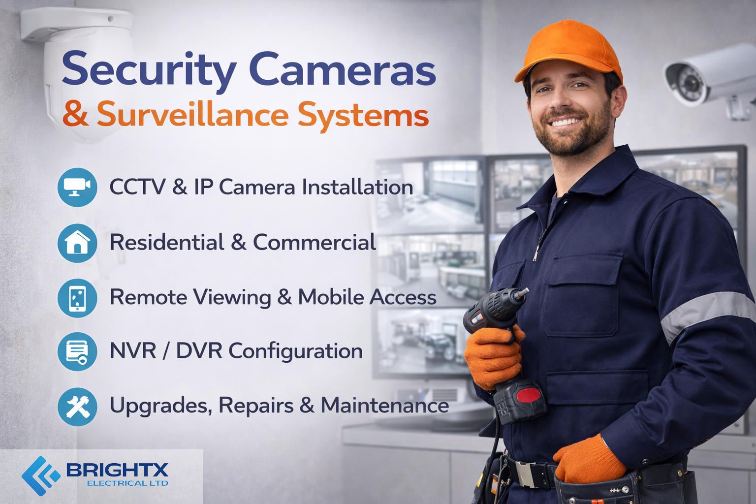 Brightx Electrical Limited provides reliable, secure, and fully compliant security camera and surveillance system services across Auckland. We design and install CCTV solutions for homes and businesses to enhance safety, deter threats, and provide peace of mind with modern monitoring technology.